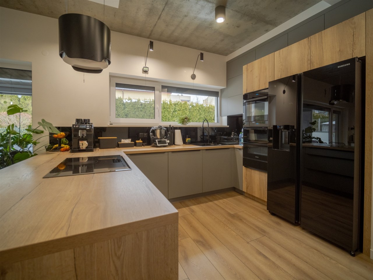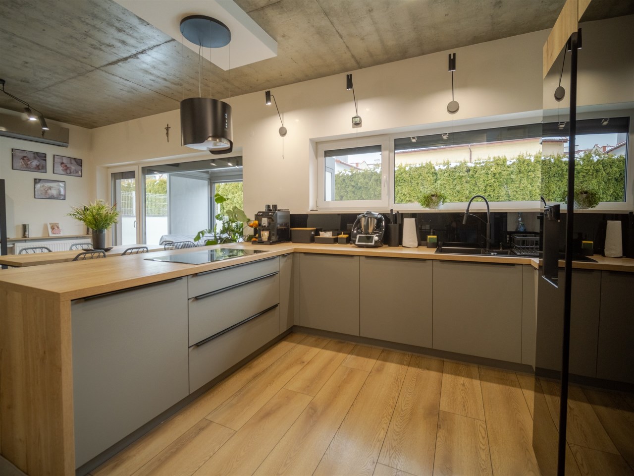 Duże, panoramiczne okna doskonale doświetlają wnętrza – nawet w pochmurne dni w domu jest jasno i przyjemnie. To idealna propozycja dla osób, które chcą zamienić duży dom na mniejszy, wygodniejszy i łatwiejszy w utrzymaniu, bez rezygnacji z przestrzeni i ogrodu.