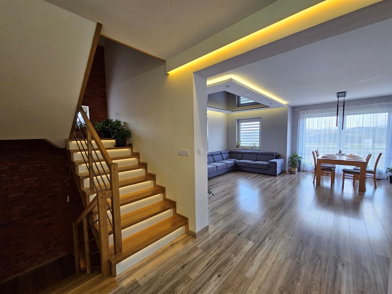 Ten wyjątkowy dom, zbudowany w 2020 roku, to idealna propozycja dla osób pragnących połączenia nowoczesnego stylu życia z urokami natury. Południowa ekspozycja sprawia, że wnętrza są jasne i przyjemne, a panoramiczne widoki na jezioro Dobczyckie dodają wyjątkowego klimatu.