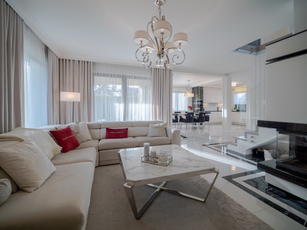 - przestronny salon z dużymi przeszkleniami i wyjściem na zadaszony taras