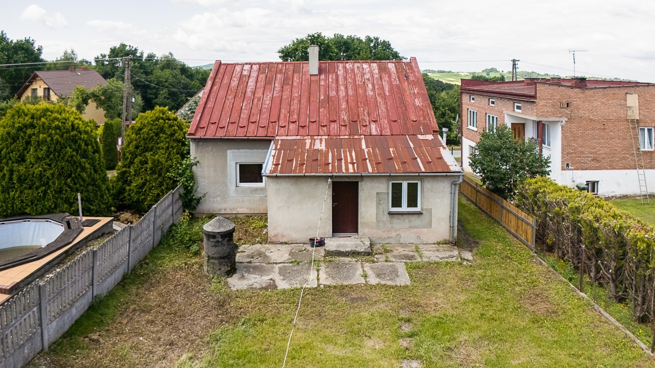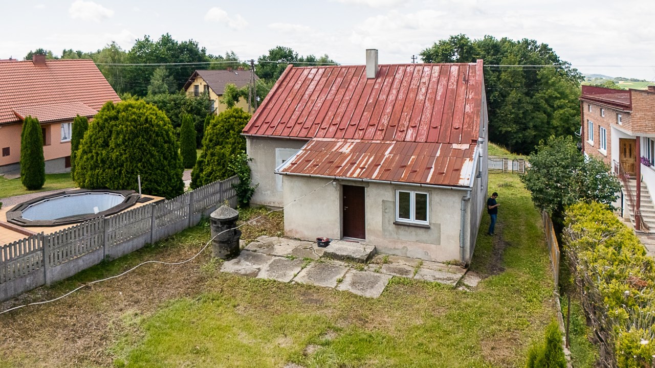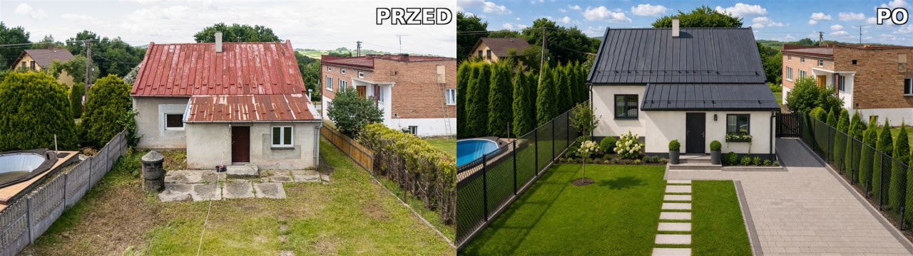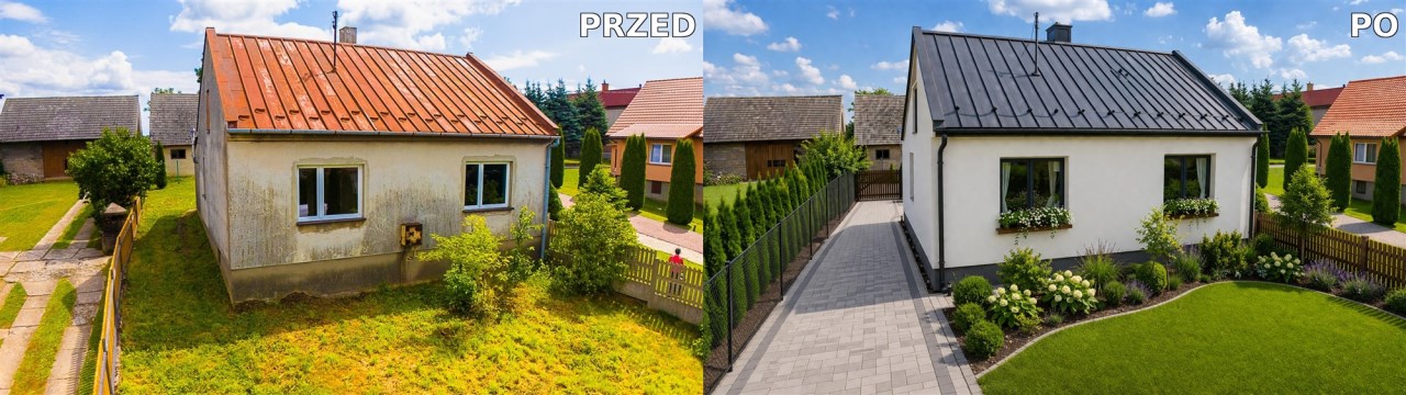 Dach kryty blachą, okna PCV, elewacja – tynk bez ocieplenia.