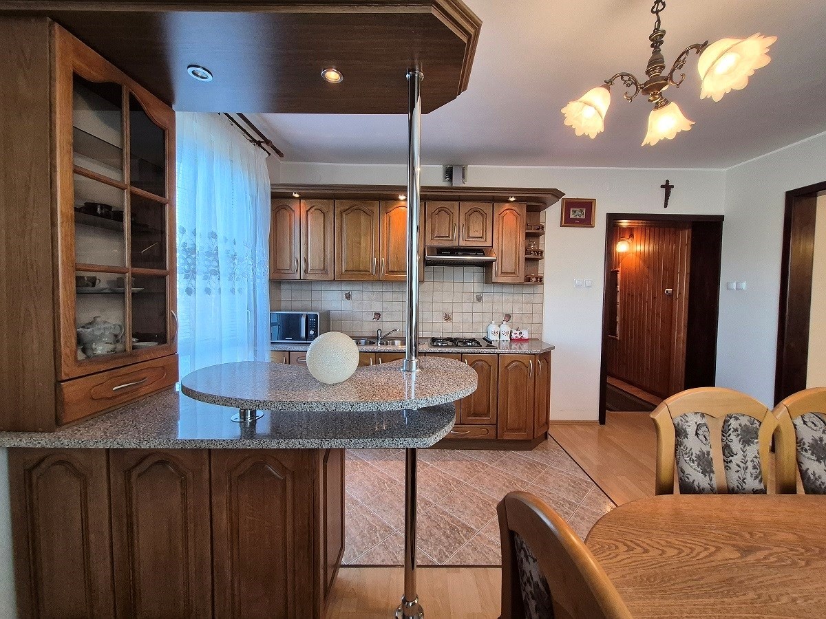 duża, jasna kuchnia z jadalnią (umeblowana, kuchenka gazowa, okap)