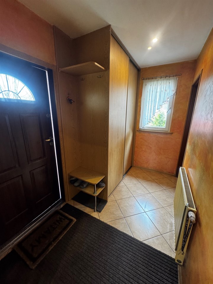 Dom z 1939r. zbudowany z cegły, docieplony styropianem 10 cm, dach pokryty papą, składa się z salonu z kuchnią w aneksie o powierzchni 20,5 m.kw, sypialni 10 m.kw, łazienki z wc o powierzchni 7 m.kw, korytarza oraz kotłowni. Na piętrze znajdują się dwie sypialnie po 12 m.kw po podłodze, korytarz i garderoba. Na piętrze wysokość pomieszczeń 2,2 m.