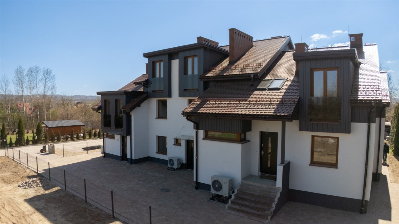Dom zbudowany z pustaków ceramicznych , docieplony 20 cm styropianem. Elewacja została wykonana z tynków niemieckiej firmy Sto, okna PCV trójszybowe, na zewnątrz kolor - złoty dąb, wewnątrz białe. Pokrycie dachu dachówka ceramiczna. Doprowadzone media: woda, energia elektryczna i kanalizacja. Ogrzewanie podłogowe na parterze, zamontowane centralne zasilanie z pompy ciepła , okna PCV. Miejsca postojowe.