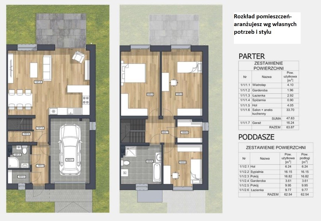 Każdy dom posiada własny ogród, garaż i taras i miejsce postojowe z kostki przed domem.