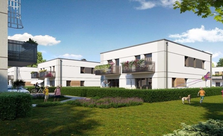 Deweloperskie domy, szeregi z balkonem 50 m.kw, ogrodem ok 17 m.kw, i tarasem ok 19 m.kw na kameralnym osiedlu, miejsca postojowe przed budynkiem.