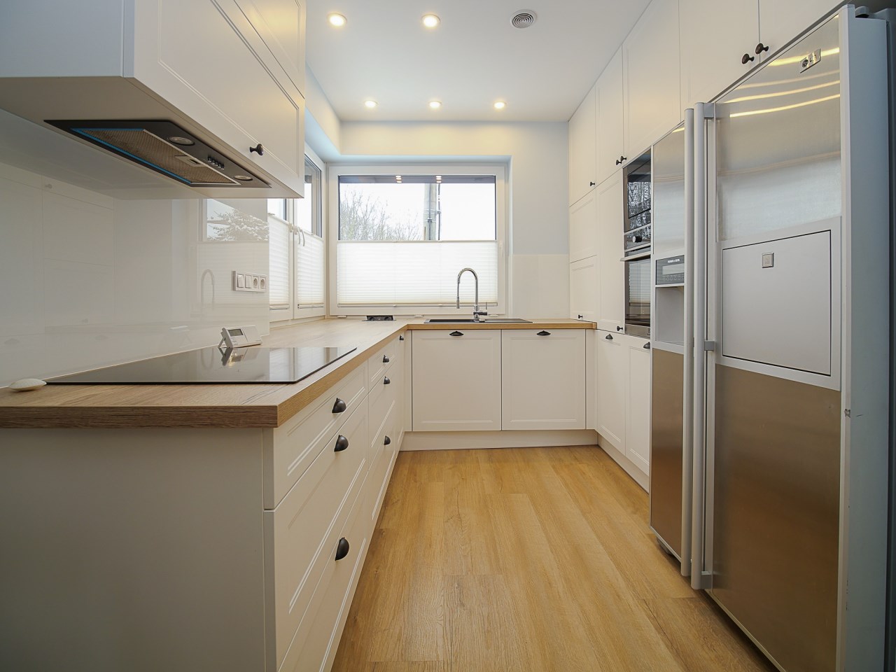 kuchnia w zabudowie z kompletnym sprzętem AGD: zmywarka, lodówko-zamrażarka, piekarnik, płyta indukcyjna, kuchenka mikrofalowa, okap,