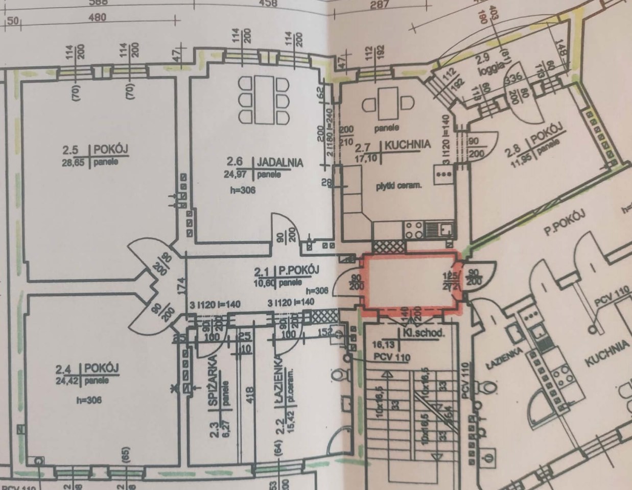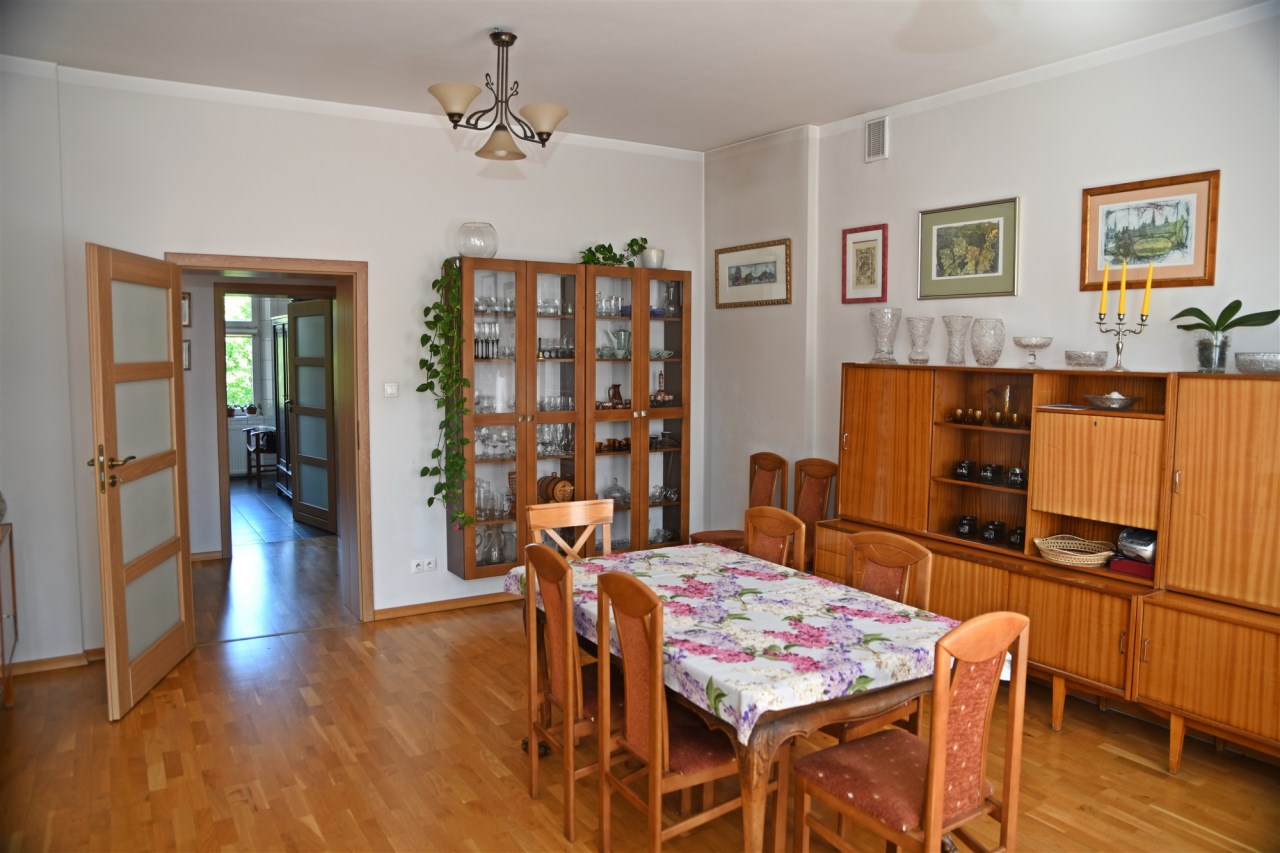 Nieruchomość składa się z 3 pokoi o powierzchni 28,65 m.kw + 24,42 m.kw + 11,95 m.kw, kuchni o pow. 17,10 m.kw połączonej z jadalnią o pow. 24,97 m.kw, spiżarki o pow. 6,27 m.kw, dużej łazienki o pow. 15,42 m.kw oraz przedpokoju o pow. 10,60 m.kw. W mieszkaniu został przeprowadzony generalny remont.