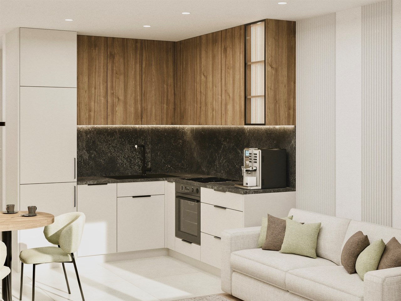przestronny salon z aneksem kuchennym z wyjściem na balkon typu loggia