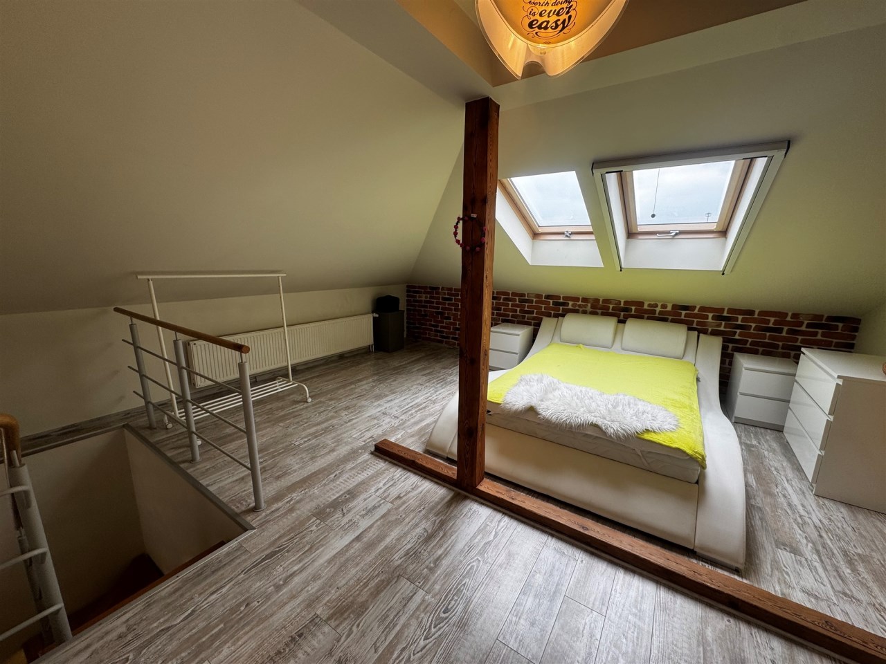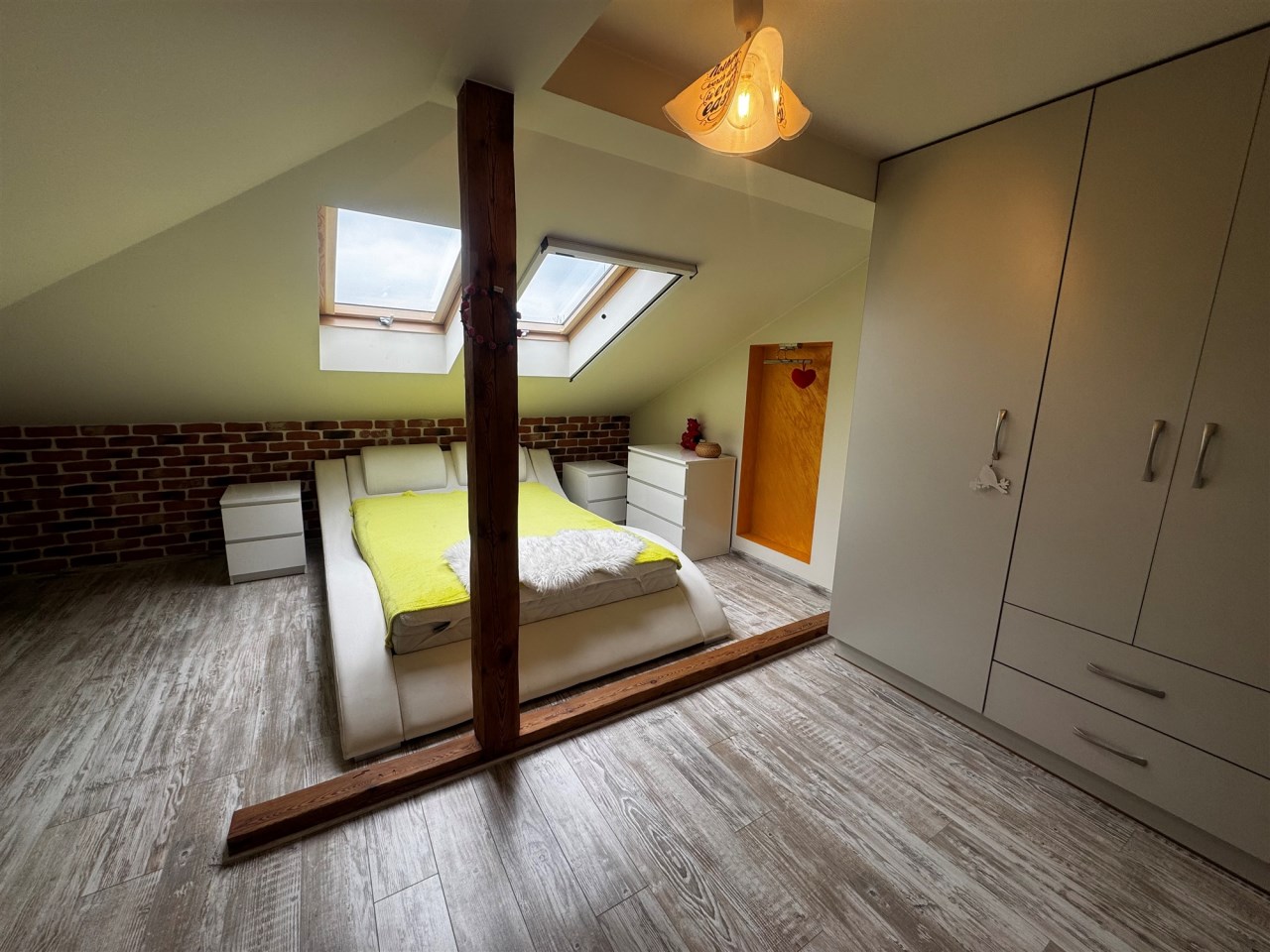 Mieszkanie składa się z: salonu z kuchnią w aneksie 32 m.kw, sypialni o pow. 10m.kw, łazienki z wc o pow. 8 m.kw oraz przedpokoju o pow. 6m.kw. Wysokość pomieszczeń 2,68 m. Dodatkowo na poddaszu znajduje się sypialnia o pow. 27 m.kw.
