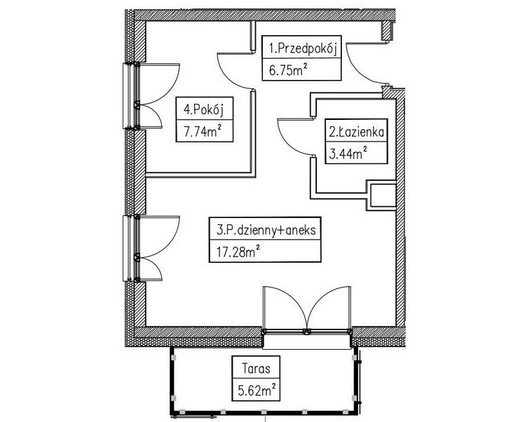 Salon połączony z aneksem kuchennym o powierzchni 17,28 m.kw, sypialnia o powierzchni 7,74 m. kw , łazienka z wc o pow. 3,44 m. kw oraz przedpokój o pow. 6,75 m.kw. Dodatkowo taras o pow. 5,62 m. kw.