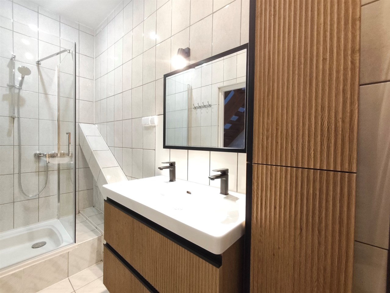 Na pierwszym poziomie mieszkania znajduje się jasny i przestronny salon z aneksem kuchennym, który tworzy funkcjonalną przestrzeń do codziennego życia i wypoczynku. Aneks kuchenny zapewnia wygodne warunki do przygotowywania posiłków. Dodatkowo na tym poziomie mieści się łazienka z prysznicem oraz praktyczny korytarz.
