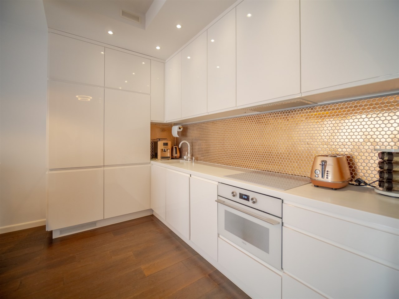 Kuchnia w pełni wyposażona w wysokiej klasy sprzęt AGD: zmywarka, piekarnik, kuchenka, mikrofalówka, ekspres do kawy, toster, blender oraz pełne wyposażenie (naczynia, szkło, akcesoria kuchenne).