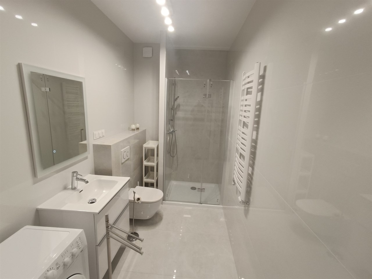 Wyposażenie łazienki | kabina prysznicowa, lustro, pralka, umywalka, WC |